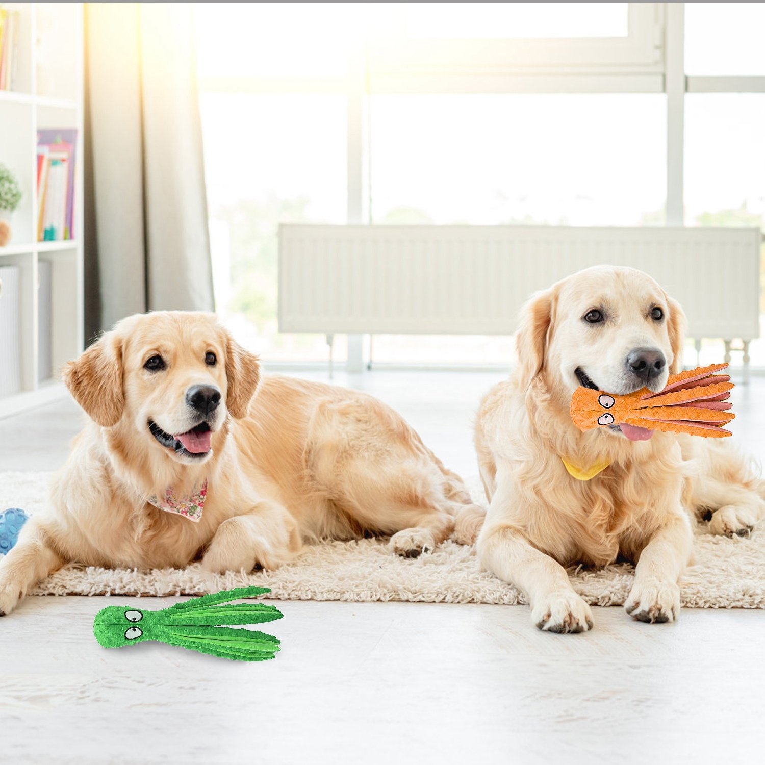 *No Stuffing Dog Toy*:Our 2pcs carton octopus-shaped toy set comes with 2 available color combination:green & orange or blue & pink,bright color will be definitely attractive for your dogs. No need to worry about your dogs swallowing or chocking while chewing or playing due to its special no-stuffing design,also makes these squeaky dog toys easy to clean and dry fast.