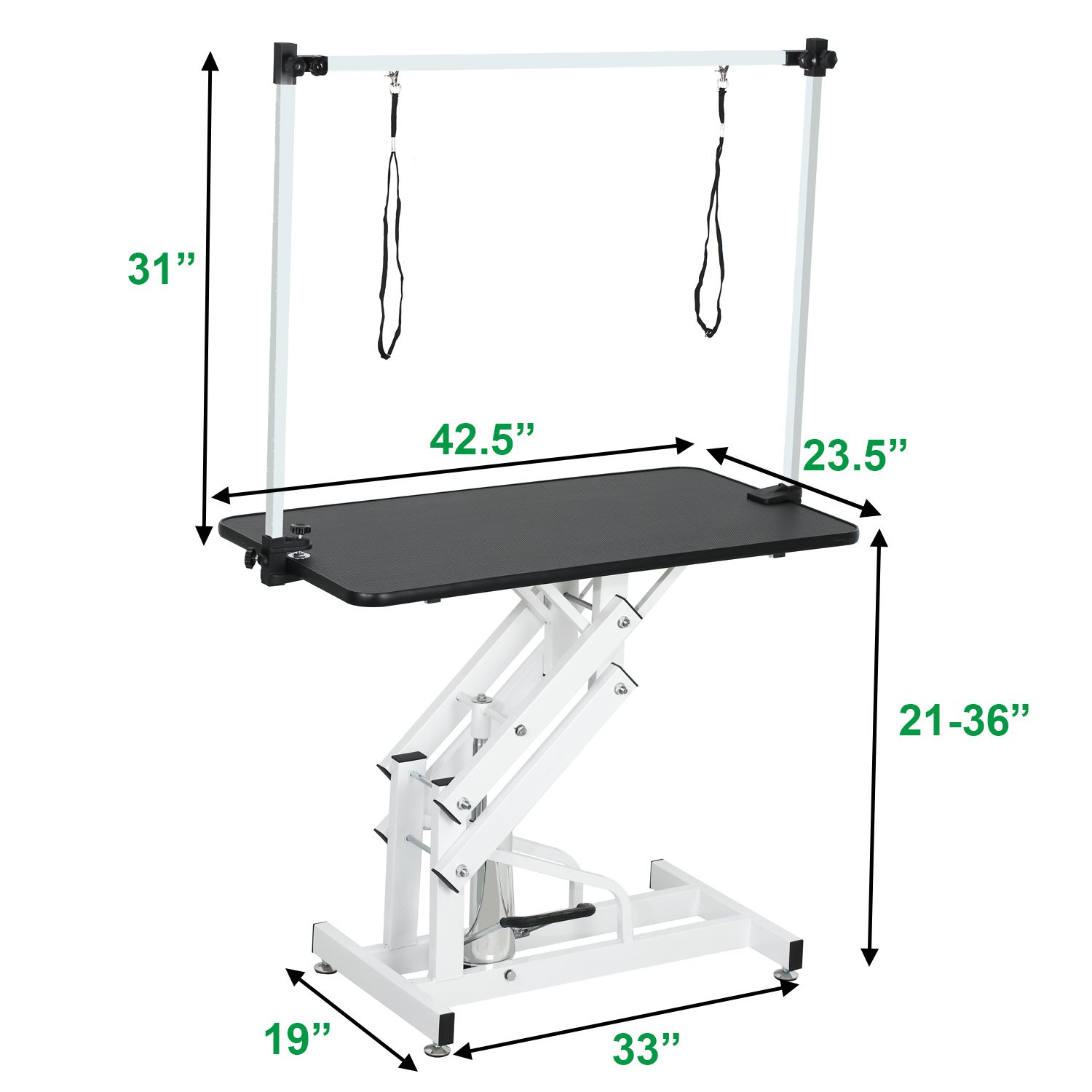 Specifications:1. Color: Black2. Style: Z-Shaped Hydraulic Grooming Table With "H" Base3. Table Dimensions: (42.52 x 23.62)" / (108 x 60)cm (L x W)4. Adjustable Height: (21.65~36)" / (55-92)cm5. Material: Steel Frame & MDF Board & PVC mat Surface, Stainless steel Arms.6. Length of Adjustable vertical Arm: 37" / 94cm7. Weight Capacity: 150 kg / 330 lbs, lift loading capacity: 110lbsThe item will be divided into two part. Part A: Weight: 27kg / 59.52lbsPart B: Weight: 17kg / 37.48lbsNote: Part A and Part B Selling Together.The Pet Grooming Table is packed in 2 different boxes. The delivery time could also be different. Please wait 1-2 more days if you only received 1 package.