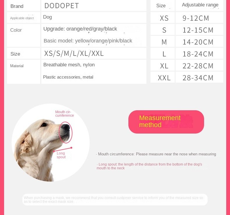 Use a soft ruler to measure the circumference of the pet mouth (the circumference of the middle of the mouth) does not need to be too tight; can be put in a finger is appropriate; according to the mouth circumference of the nearest size of the muzzle.