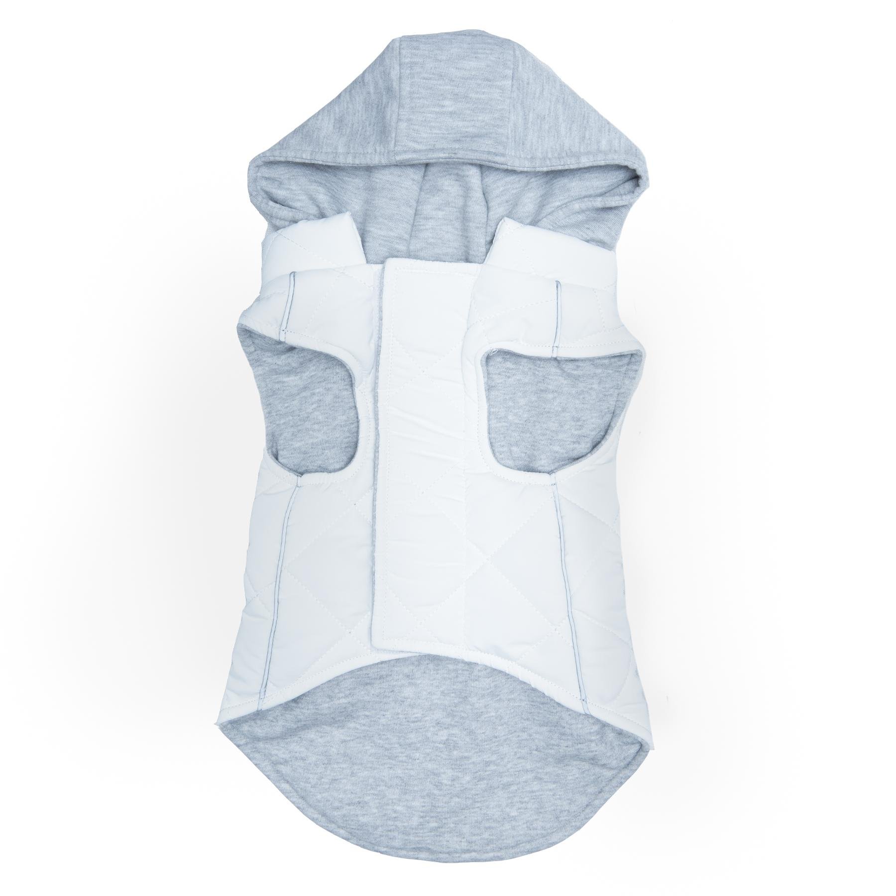 Our quilted Weekender Sweatshirt Hoodies are great for pups on the go! The outer shell is a quilted puffer style while the inner lining is cozy, jersey material. The hood is also made of jersey material and can easily zip off when not needed. Reflective stripping makes your pup noticeable in low light while the two-inch fastener down the chest provides an adjustable closure. Zippered pockets on the back provide a cute finishing detail, as well as an easy place to stash a few treats or a waste bag.